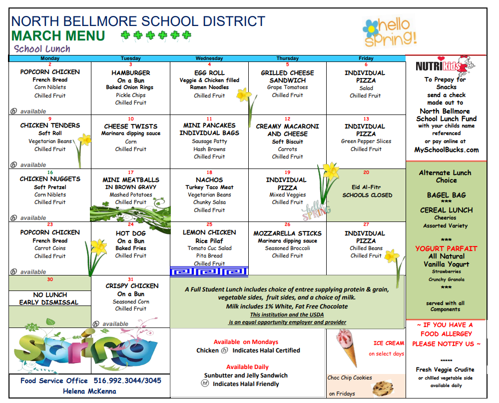 Dear North Bellmore Families,Please see the March lunch menu below: