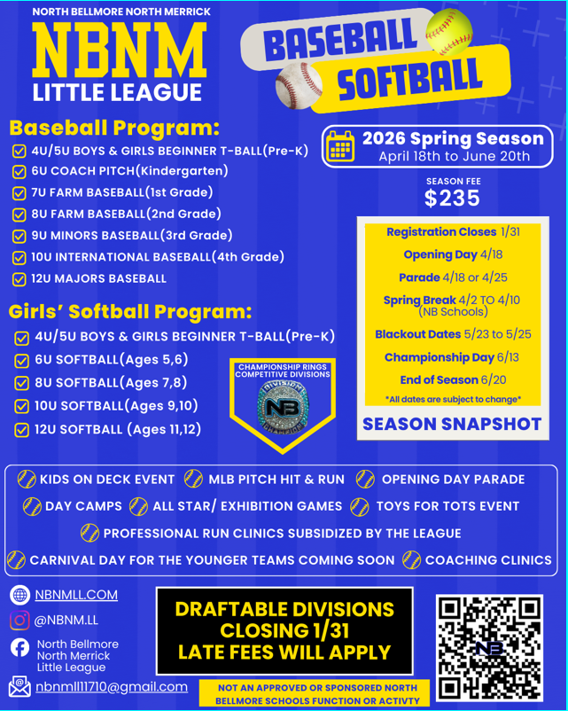 Please see the updated flyers below from the NBNM Little League. Kids on Deck is a free instructional clinic being offered on January 25, 2026. Also, please see the registration flyer outlining all of the available baseball and softball programs that the NBNM Little League offers.